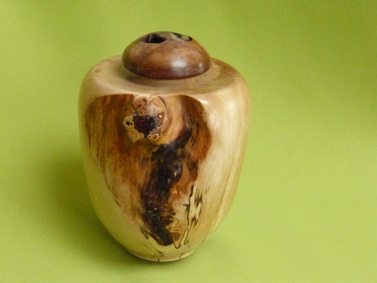 Verkocht. Deze pot kan natuurlijk gewoon als kunstobject neergezet worden. Maar er kunnen ook dierbare herinneringen in opgeborgen worden. Gemaakt van beukenhout met een deksel van banksianoot (Australië).