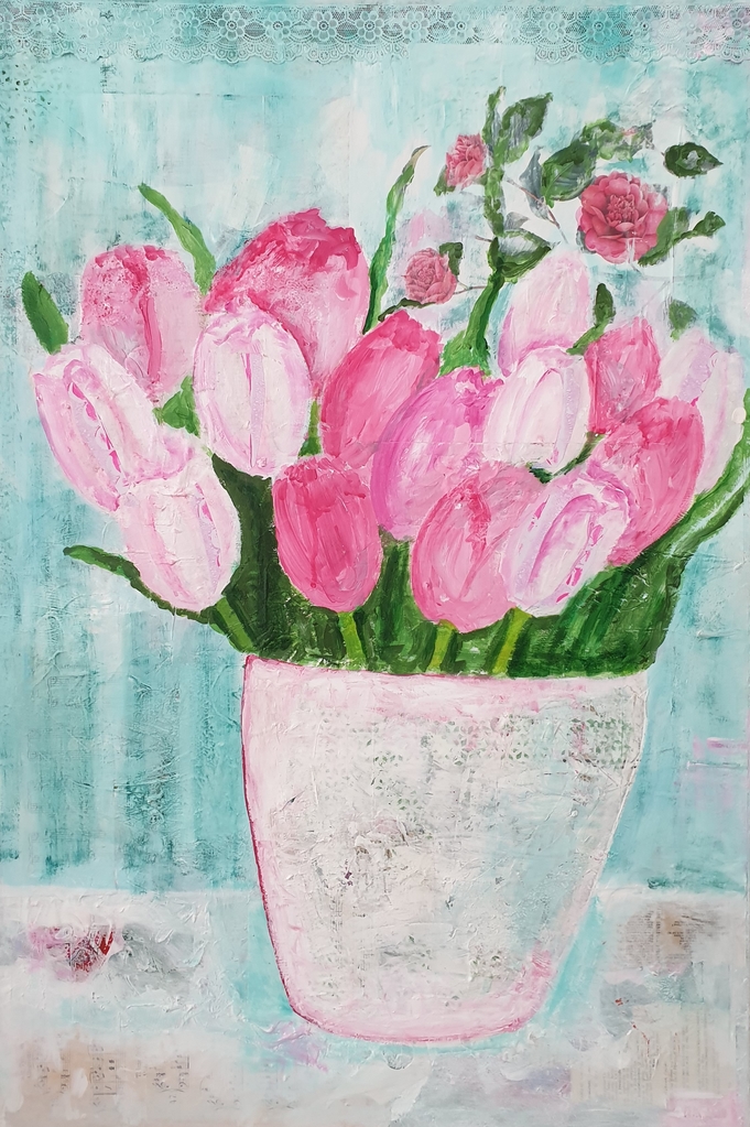 Experimenteren met verschillende materialen en technieken, op papier en doek en in mijn art journals, brengt mij veel plezier. Inspiratie is overal! Ik hou van bloemen, van mensen, van de zee, van kleur en van het (her)gebruiken van allerlei papier. Vaak gebruik ik foto’s ter inspiratie.