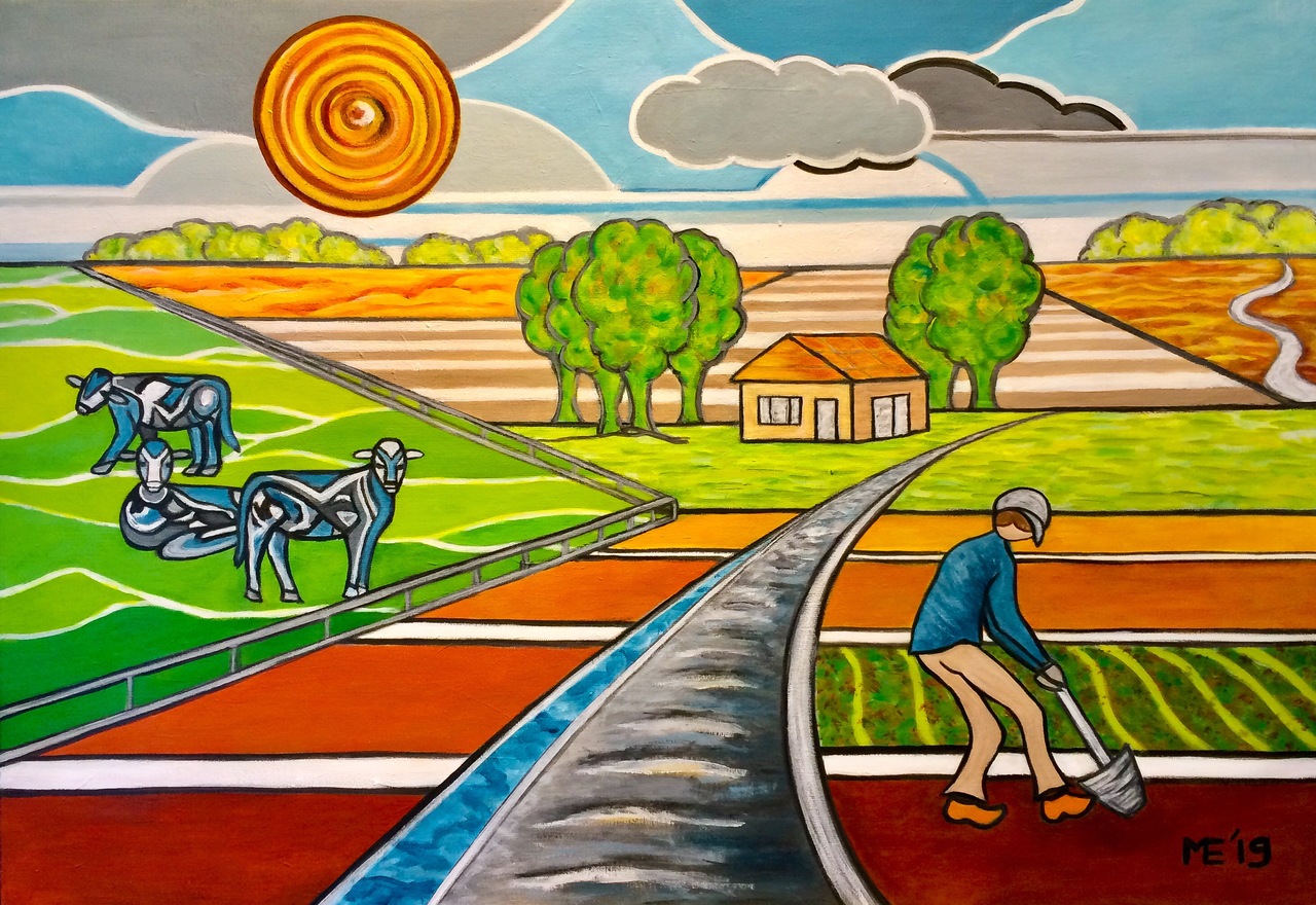 Zomers weidelandschap met nieuwsgierige koeien en 'klein huisje op de prairie', gebaseerd op mijn geboorteplek.