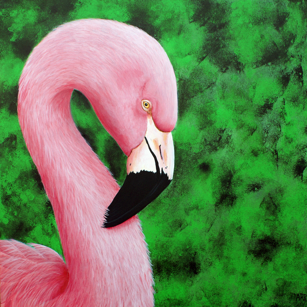 Schilderij Vogel Roze Flamingo Vogelschilderij Bird Painting Pink Groen Green