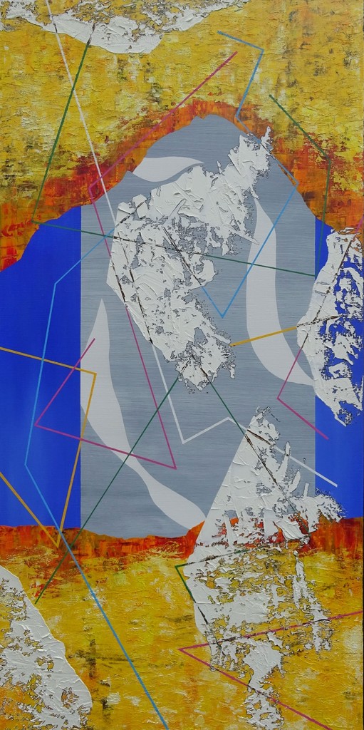 Abstract schildrij uitgevoerd in Olieverf en Inkt op Linnen. Gesigneerd en ingelijst (stalen baklijst). Zowel verticaal als horizontaal te plaatsen.