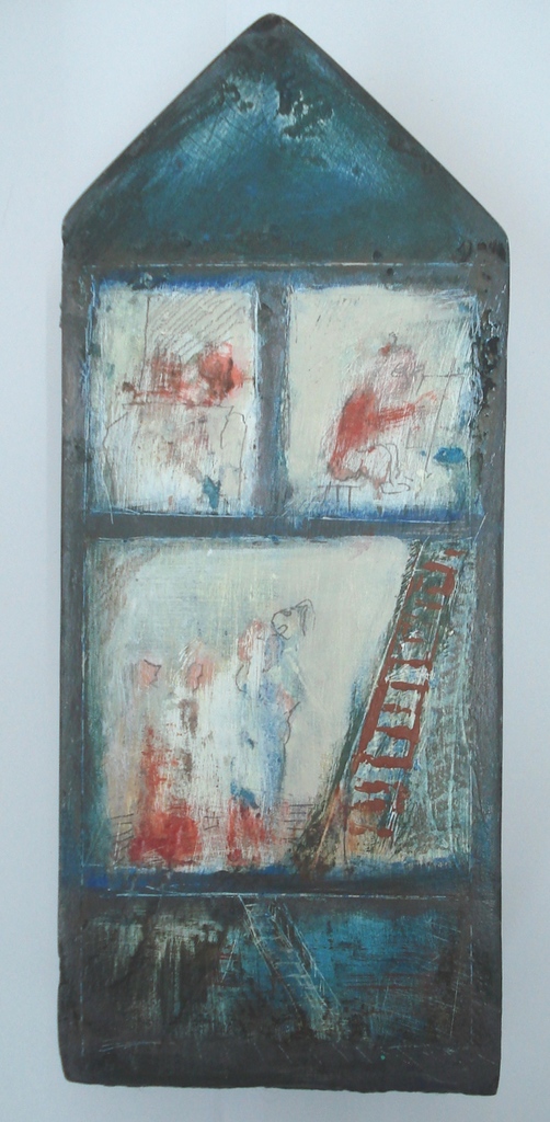 Het huis met de ladder is een bewerking van een houtblok. In het huis gebeurt van alles, de beschouwer ziet alleen de buitenkant en een glimp door de ramen, waar de bewoners in de weer zijn met onbekend en nooit geweten...