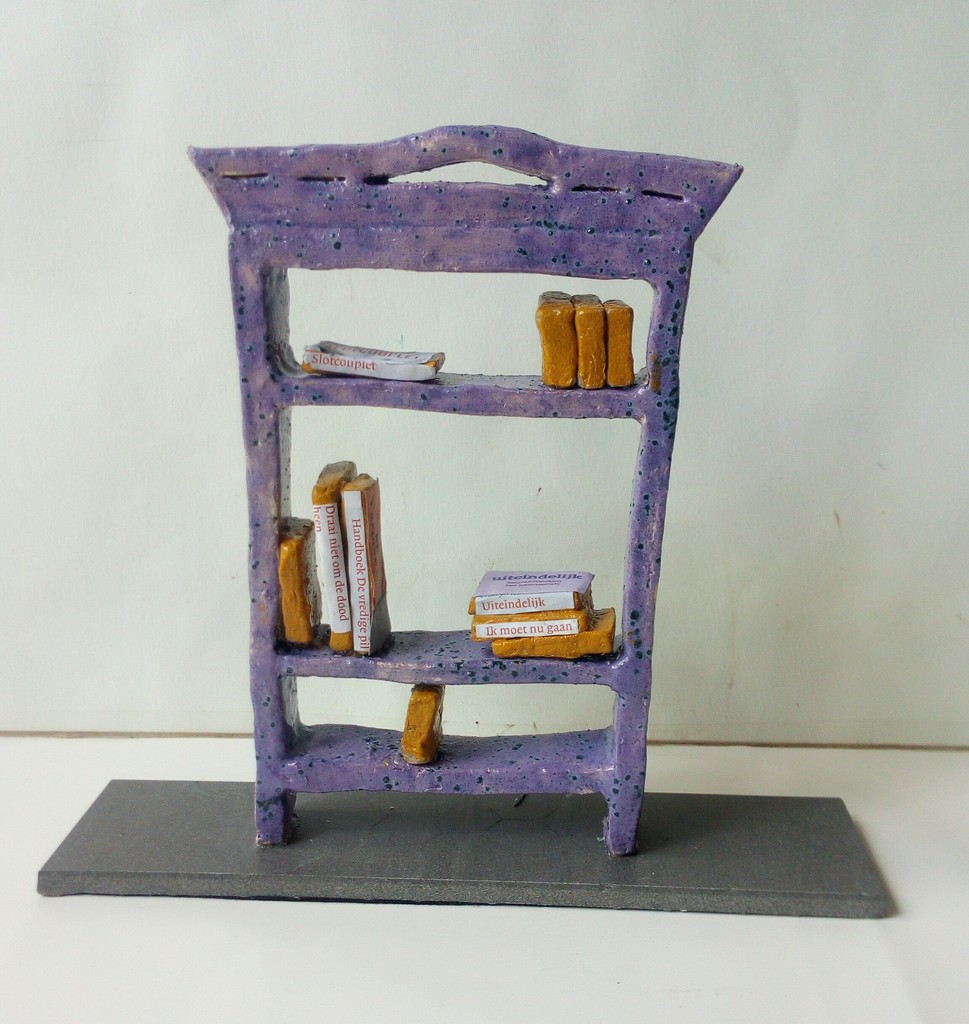 Een vrolijke paarse boekenkast met boeken over het levenseinde.