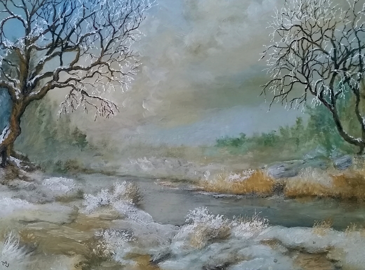 Winterlandschapje op doek volgens eigen voorstelling. Centraal staan de diverse kleurcombinaties.