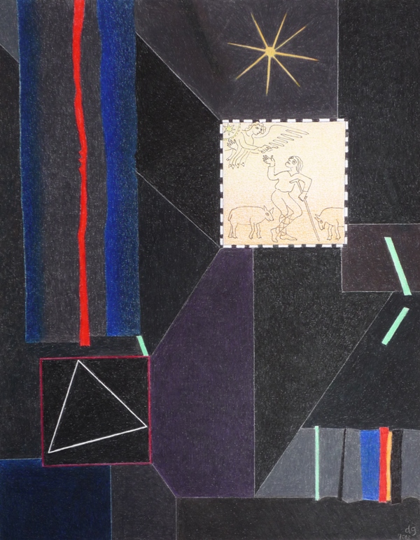 abstracte kompositie met tekening van de verkondiging aan de herders