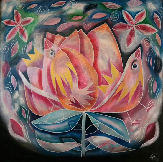 Door gebruik van parelmoer-acrylverf, laag over laag, is dit schilderij enigszins glanzend. Een bloem, bestaande uit twee vogels. Deze staan voor 'open gaan', durven, zichtbaar zijn, bloeien, ook al is dat soms moeilijk. Je kleuren laten zien, net als een bloem. Voordat je de uiteindelijke kleuren, het volle leven, ziet, moet de bloem zich eerst openen.