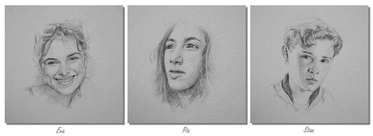Opdracht drie tekeningen van twee zussen en broer (met toestemming geplaatst)