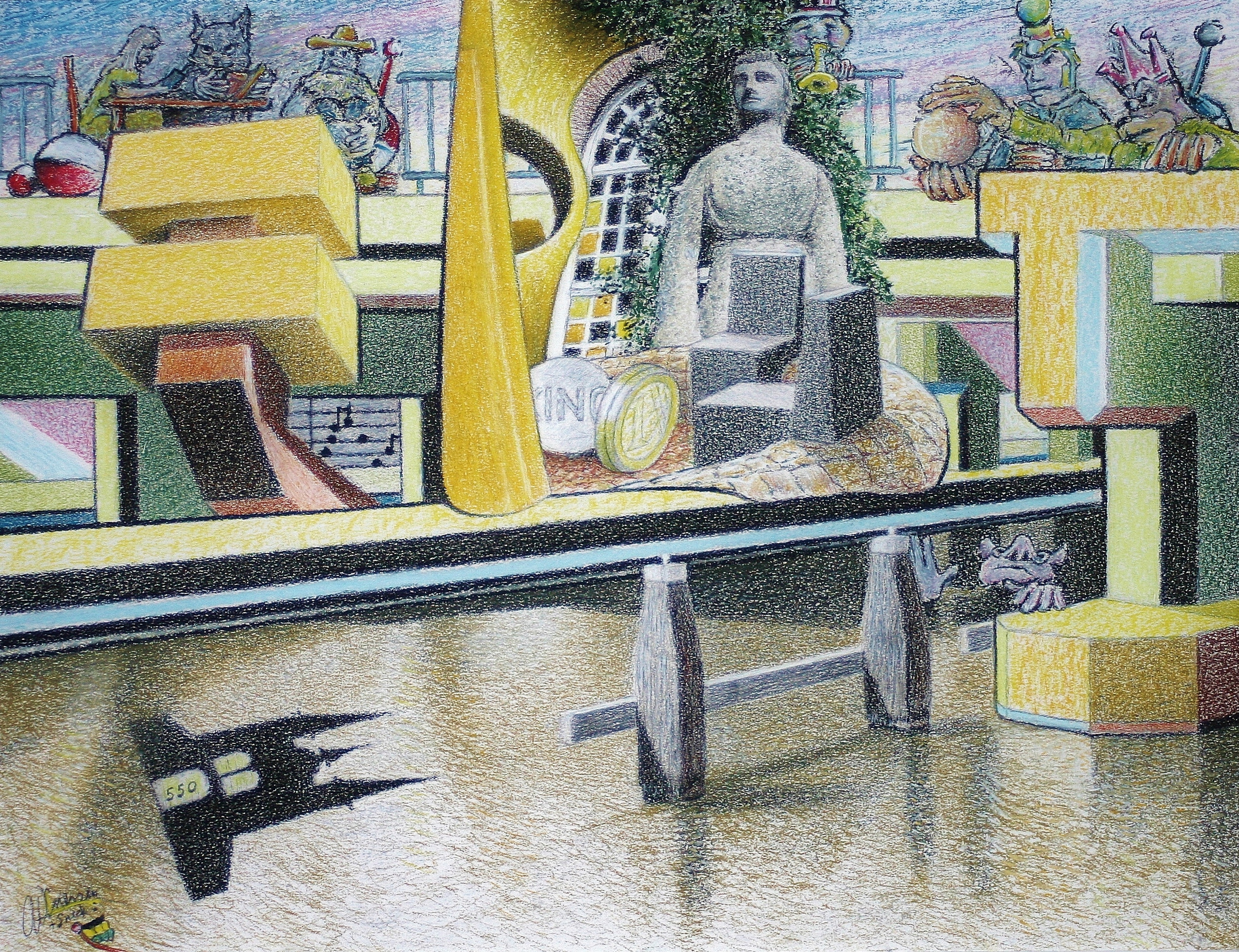 .. in het water - en ook een Barg - zetelt Sneek al .. 550 jaar tussen Weg en Water .. temidden van Water - Bal - en Dobbersporten doceert ook de Streng Listige Tom Poes .., en het naast hem zittende Al Weten, de Ontvankelijke Jongere .. die Harmonieus uit wil spruiten tot Een Weloverwogen Architectuur van De Geest .. die zich wil herkennen in zijn omgeving .. (230)