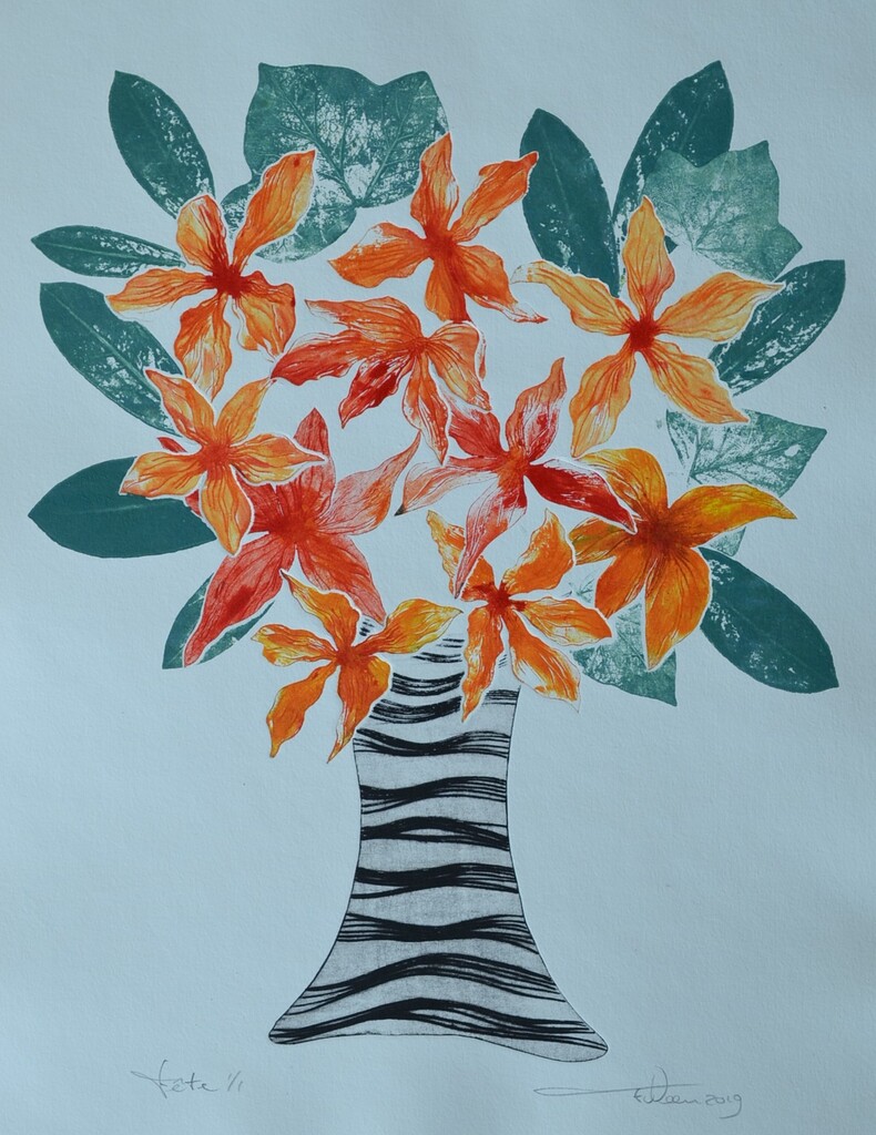 Feest / Fête - droge naald en aquatint - uitgezaagde zinkplaatjes - monotype - meerkleuren druk - oplage 1/1