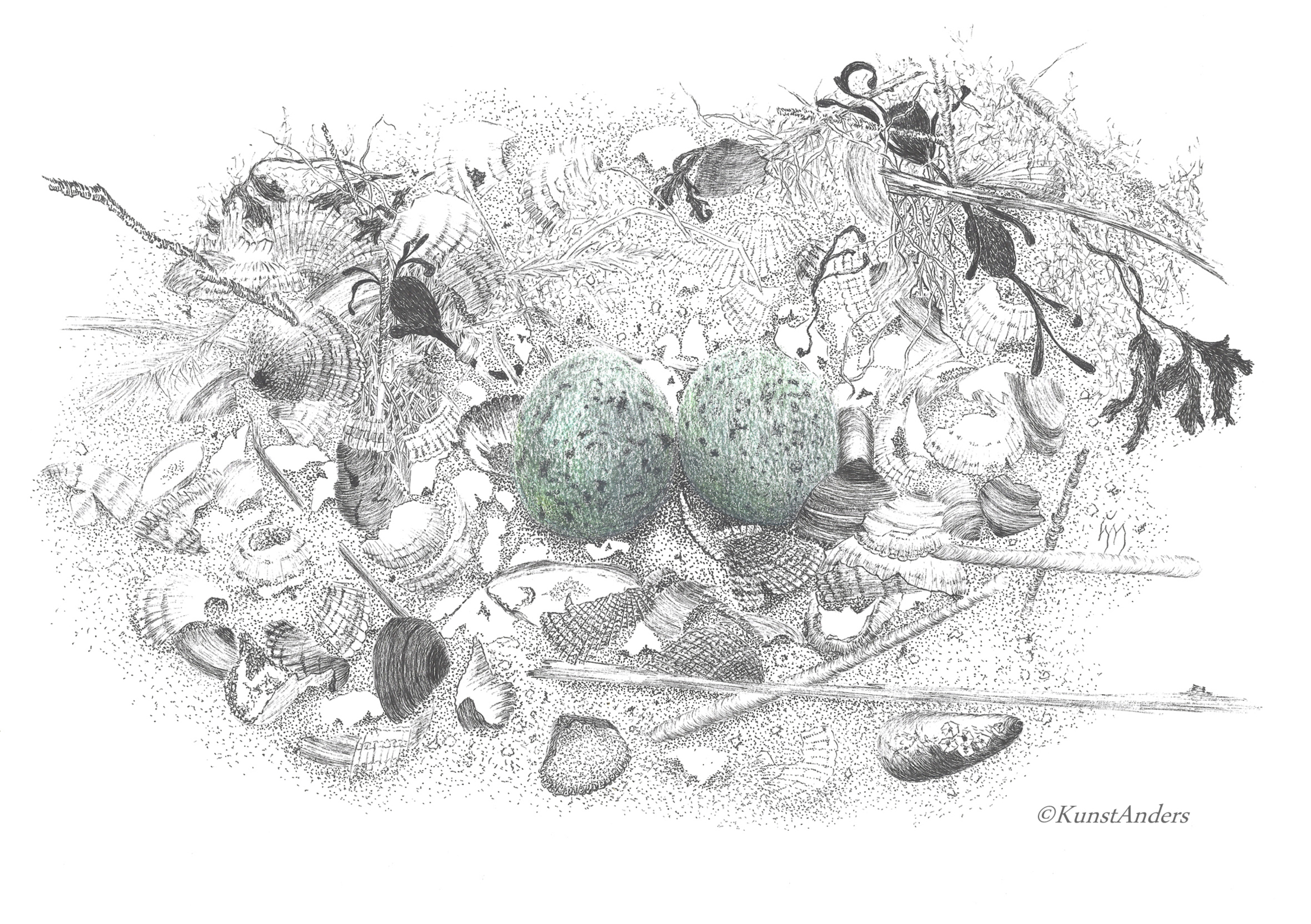 Vaak leggen ze hun eieren in niet meer dan een kuiltje in het zand met daaromheen allerhande materiaal wat ze maar ter plekke bij elkaar kunnen sprokkelen, bijvoorbeeld schelpjes, messen en blaasjeswier, zoals hier op de tekening....