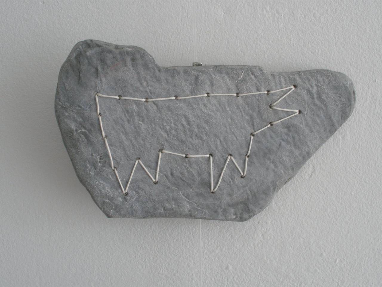 Doorboorde steen, geborduurd met primitieve diervorm "Lascaux"