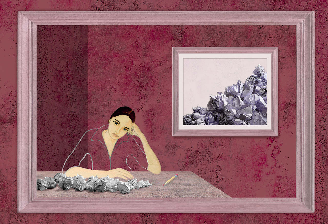 Rood Vrouw Art Woman Kunst Red Lijst Roze Girl Pink Interieur Writing Schrijven Frame Recycling Interior Creativiteit Proppen Creativity Wads Lumps