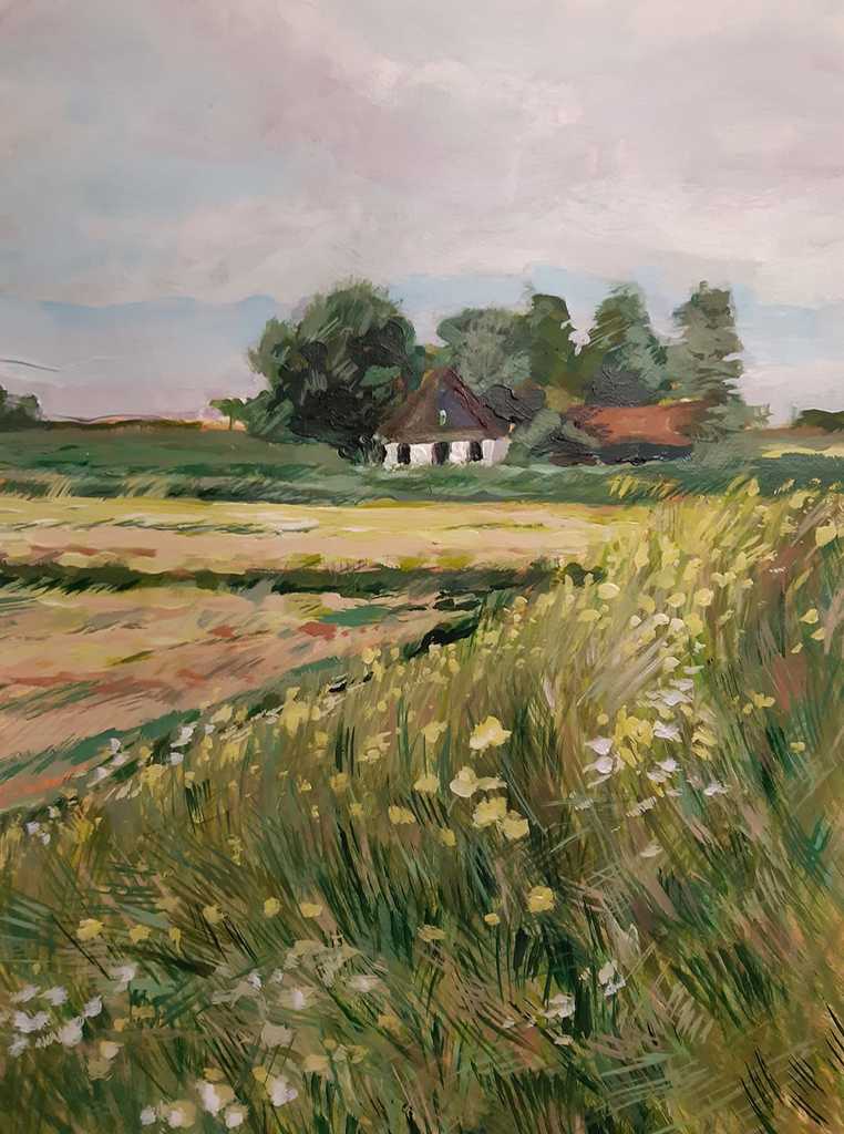 In vrije stijl geschilderde boerderij vanaf dijk in Beets