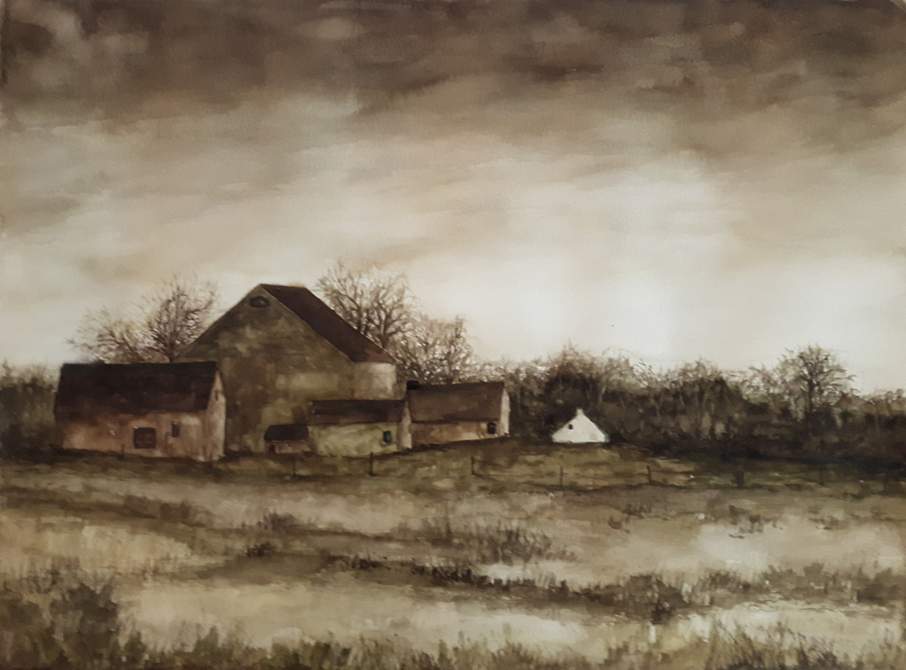 Sinds enige tijd ben ik gefascineerd door het werk van de Amerkaanse kunstenaar Andrew Wyeth (1917-2009). Hij is een van de bekendste en meest geliefde kunstenaars van de Verenigde Staten en schilderde vooral het platteland van Pennsylvania en Maine. Het werk van Wyeth herken je aan zijn beperkte palet bestaande uit aardetinten. Als materiaal gebruikte hij vaak waterverf en ei tempera. Al werkte hij precies en gedetailleerd, toch ging hij voorbij het pure realisme door aan elk werk een bepaalde emotie toe te voegen. Zijn werk valt daardoor te plaatsen in het magisch realisme. Ik probeer hem in mijn aquarellen hem volledig te imiteren, maar me vooral op door door hem gecreëerde sfeer te concentreren. En daar dan een eigen invulling te geven. Het aquarel is gemaakt op 300 grams papier (Canson). De vermelde verkooprijs is zonder lijst / glas.