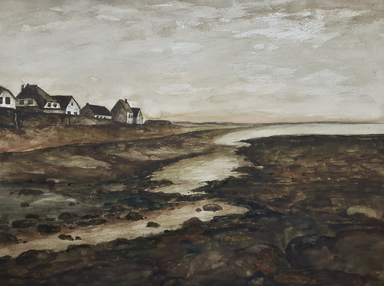 Normandische en Bretonse kusten hebben me altijd gefascineerd. Ruig. Oer. En voor wat Normandië betreft ook nog eens geteisterd door de invasie aan het einde van de Tweede Wereld Oorlog. Bij deze aquarel heb ik tevens de kleuren van de Amerikaanse kunstenaar Andrew Wyeth (1917-2009) gebruikt. Hij is een van de bekendste en meest geliefde kunstenaars van de Verenigde Staten en schilderde vooral het platteland van Pennsylvania en Maine. Het werk van Wyeth herken je aan zijn beperkte palet bestaande uit aardetinten. Als materiaal gebruikte hij vaak waterverf en ei tempera. Zijn werk valt daardoor te plaatsen in het magisch realisme. Ik probeer hem in mijn aquarellen hem volledig te imiteren, maar me vooral op door door hem gecreëerde sfeer te concentreren. En daar dan een eigen invulling te geven. Het aquarel is gemaakt op 300 grams papier (Canson). De vermelde verkooprijs is zonder lijst / glas.