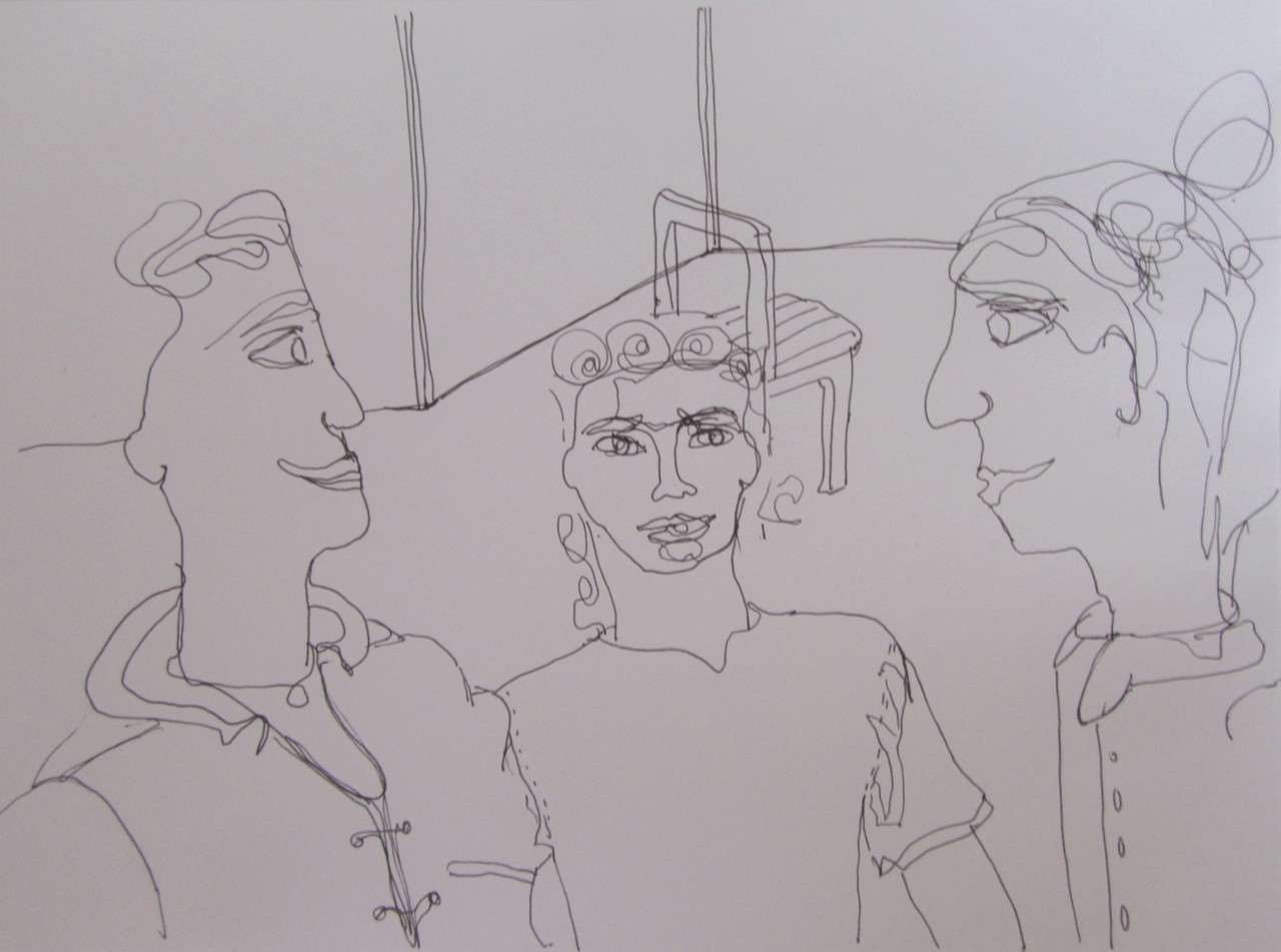 Tekening. Pen op papier. Spontane tekening van mensen die in gesprek zijn