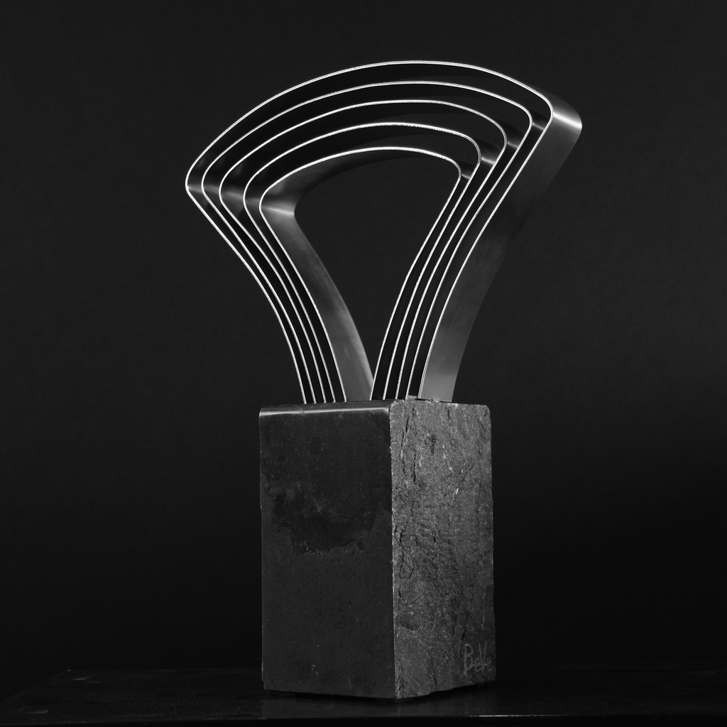 De RVS strips zijn 4 cm breed en 2 mm dik. Deze zijn vast gemonteerd op een hardstenen sokkel, van 20 cm hoogte, met behulp van RVS busjes.