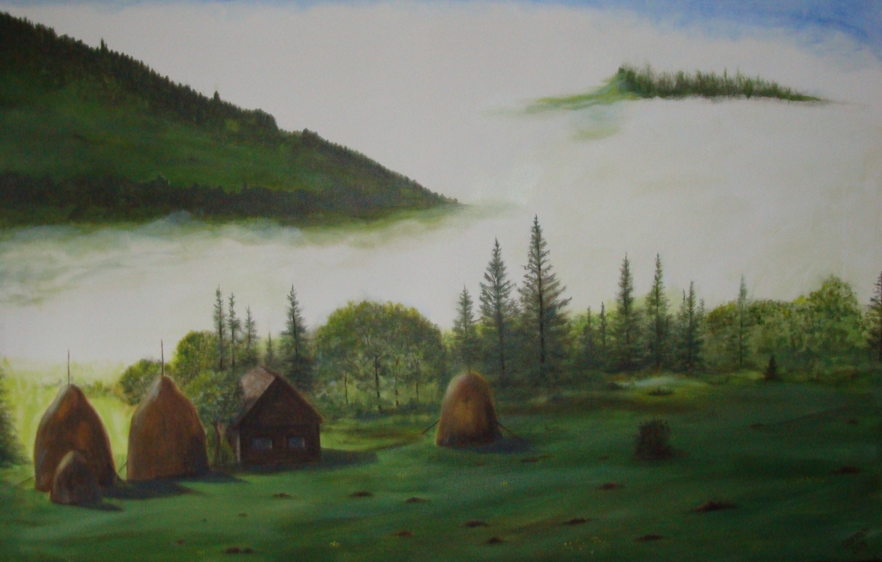 Acryl op doek met de misten van Transsylvania. Dit Landschap is regelmatig zichtbaar en is vergelijkbaar met de witte Wieven op de Veluwe. Dit schilderij heeft een lijst.