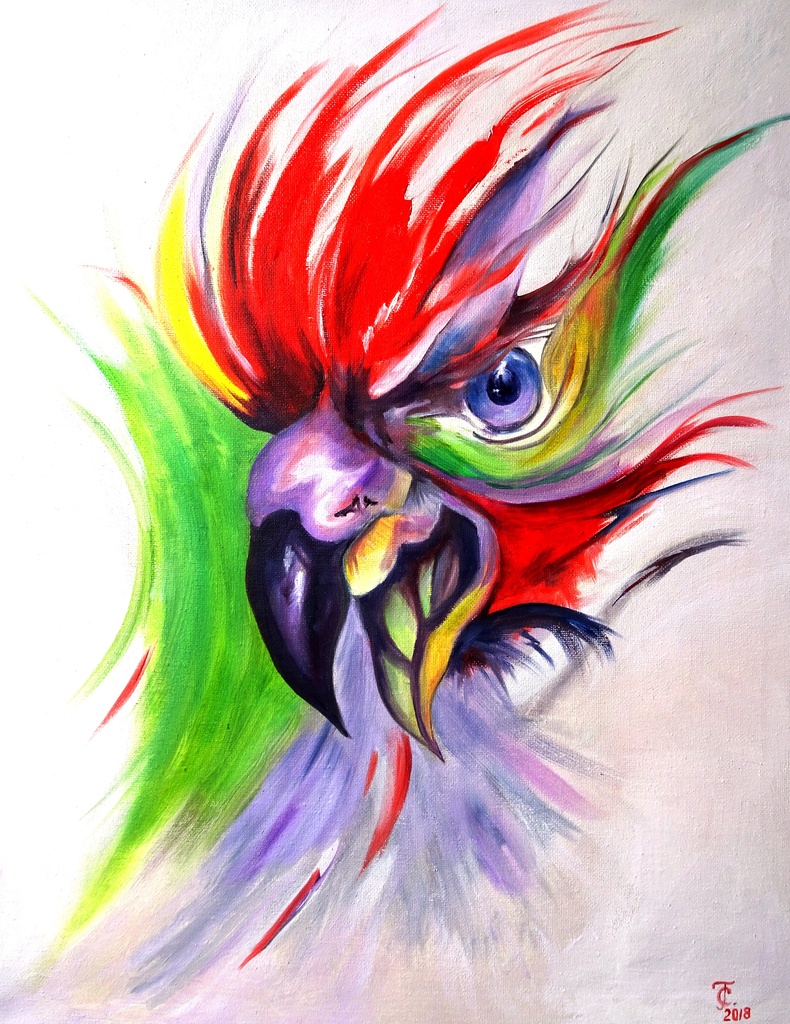 Deze levendige kleuren benadrukken de schoonheid van een Ara, terwijl de Ara zelf kan staan voor trouw, wijsheid en het vermogen om te imiteren, zoals te zien in veel oude culturen en kunst. De levendige kleuren van de papegaai, zoals groen, blauw, rood en geel, worden gebruikt om de vogel te benadrukken en kunnen staan voor een brede reeks emoties en ideeën. De kleurrijkheid symboliseert de pracht en rijkdom van de natuur. Schildertechniek olieverf op doek.