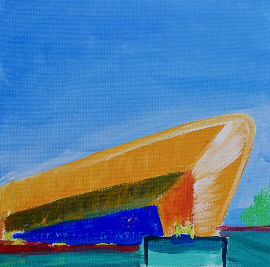 Het Centraal Station in Rotterdam, alias 'De Haaienbek' in een vierkant werk op doek met sprankelende kleuren en zo minimalistisch mogelijk. Een internationaal gevoel van vrijheid krijg ik wanneer ik over het plein voor het Centraal Station in Rotterdam loop. In een paar streken, zolijkt dit werkgemaakt te zijn, acrylopdoek in een prachtige houten baklijst