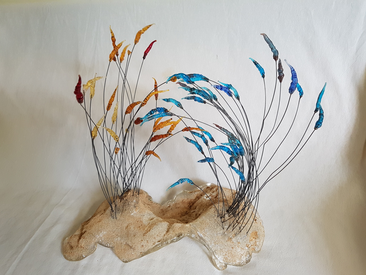 gegoten glas en pluimpjes gemaakt aan de brander