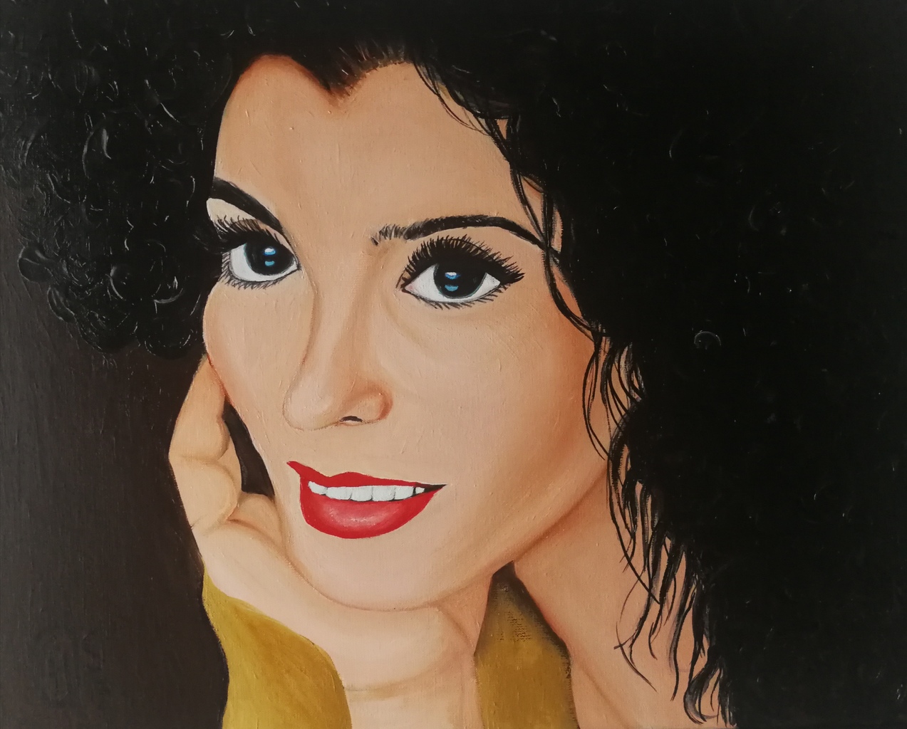 Portret van Nadia. Krullen zijn in 3D erop geschilderd. Ingelijst in een zwarte baklijst
