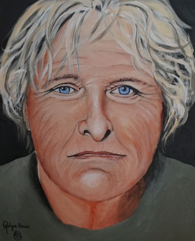 Portret van Rutger Hauer. Het werk is ingelijst