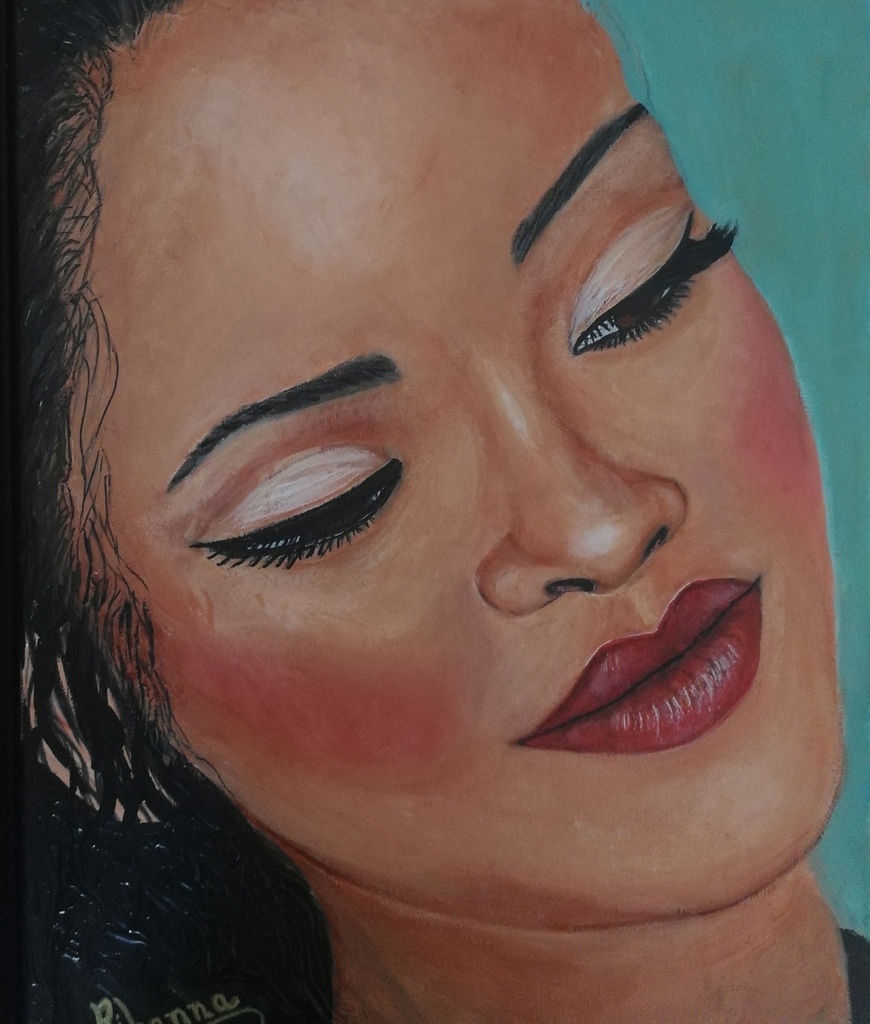 Portret van Rihanna. Ingelijst in een zwarte baklijst.