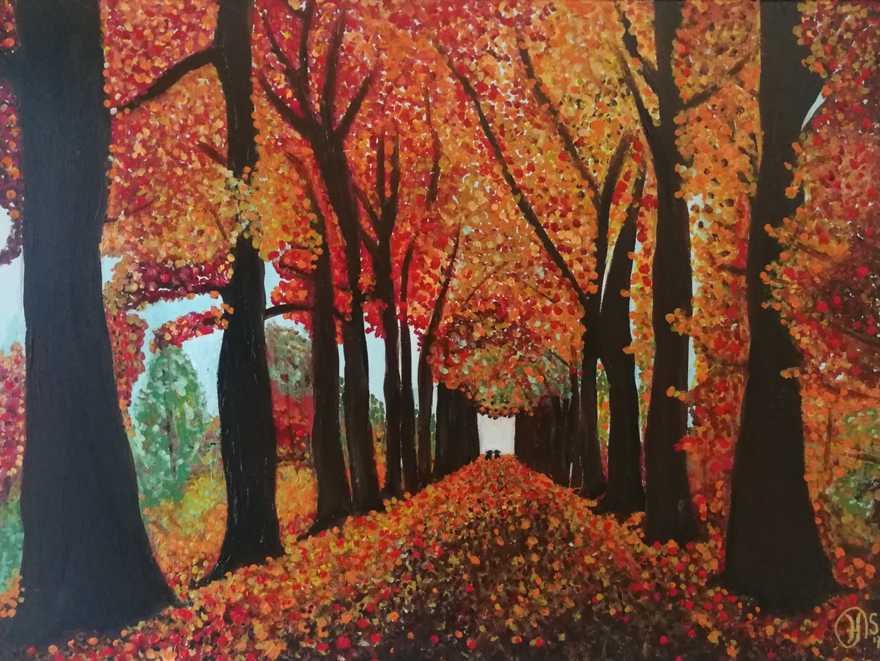 Dit schilderij is een pointellistische weergave van een herfstbos in Oost-Nederland. In de verte zijn 2 teckeltjes te zien. Het is ingelijst in een bruine baklijst.