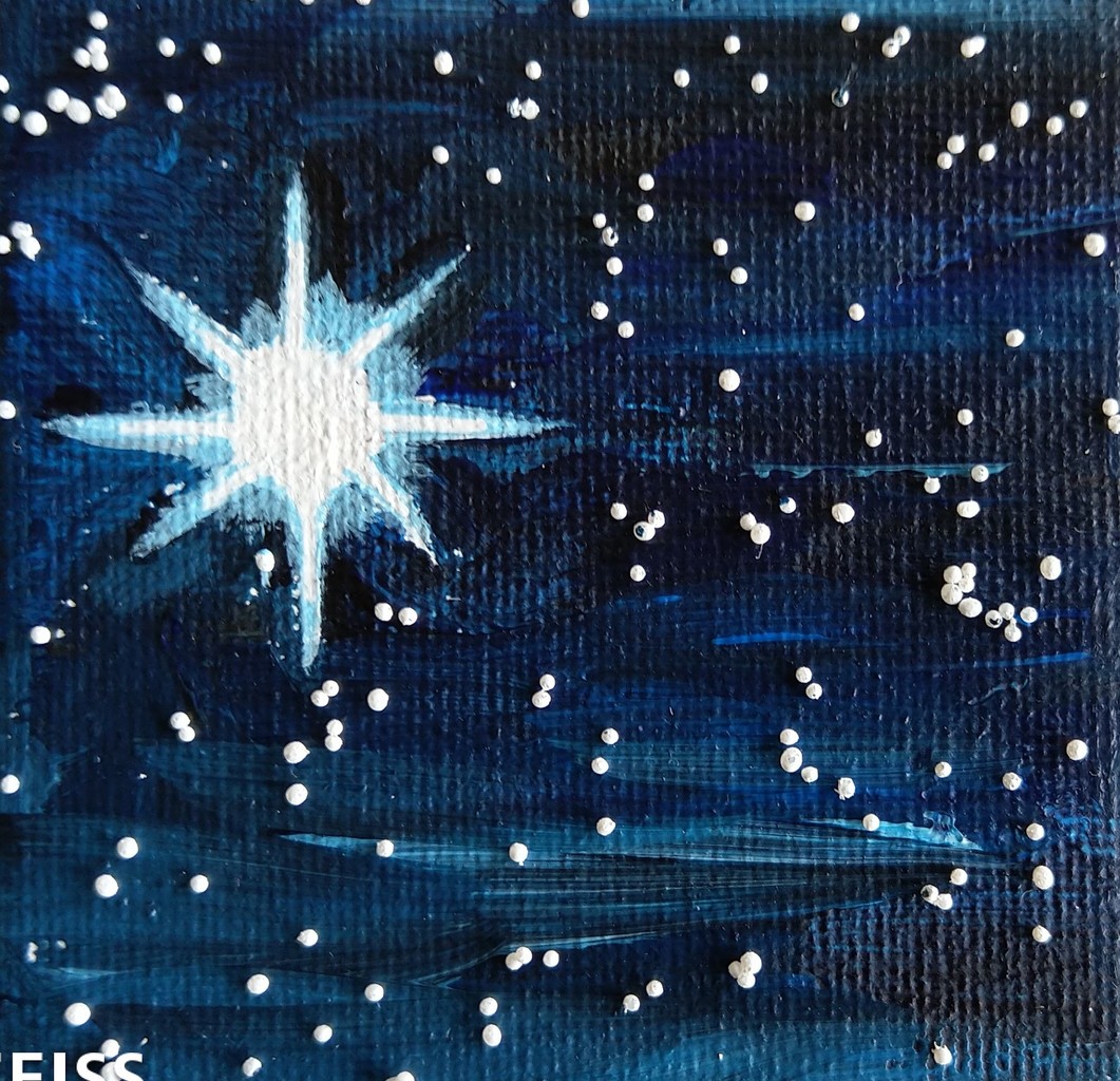 Een mimiatuur schilderijtje dat wordt gemonteerd op een ezeltje en komt met kerst 2019 te hangen in de kerstboom in het Museum Maassluis. Het is dus nog niet te koop. In de lucht zitten glasballetje als sterren.