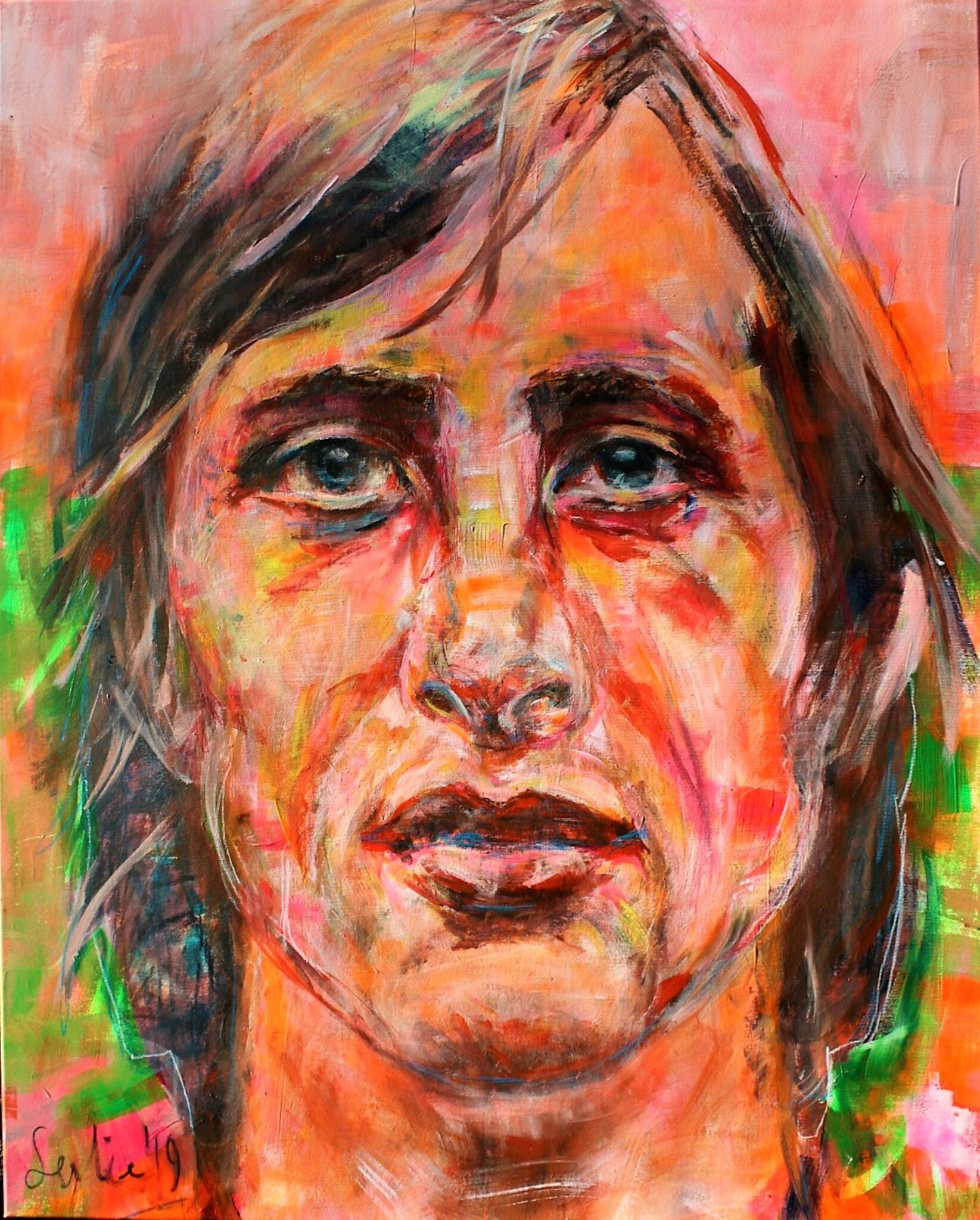 portret Johan Cruijff, geschilderd op doek, met houten frame, zijkanten meegeschilderd, klaar om op te hangen