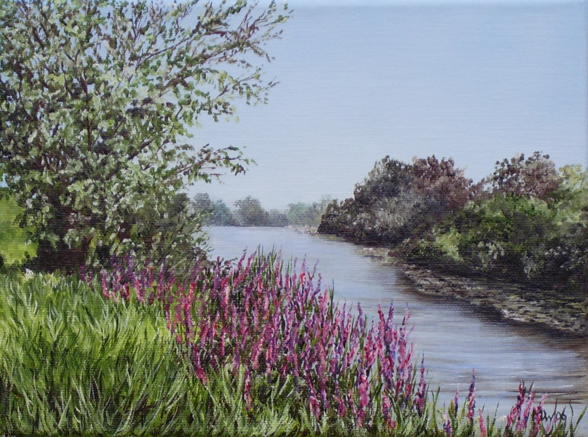 Olieverfschilderij van een rivieroever.