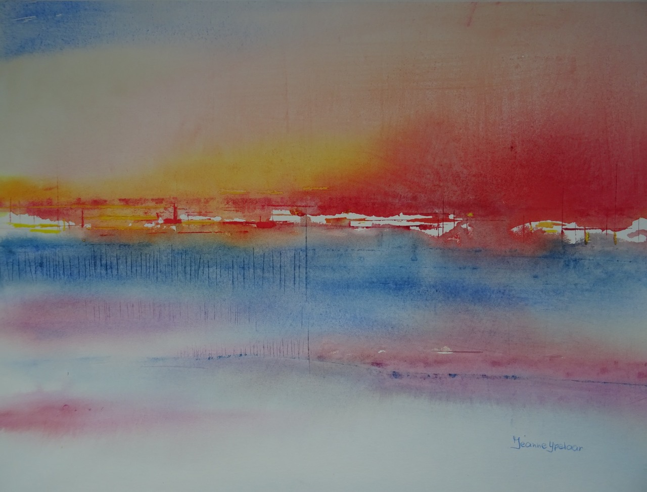 Aquarel van een zonsondergang geschilderd nat in nat.