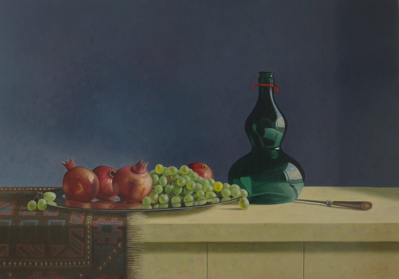 De compositie wordt gevormd door de groene fles met de schaal met druiven en granaatappels