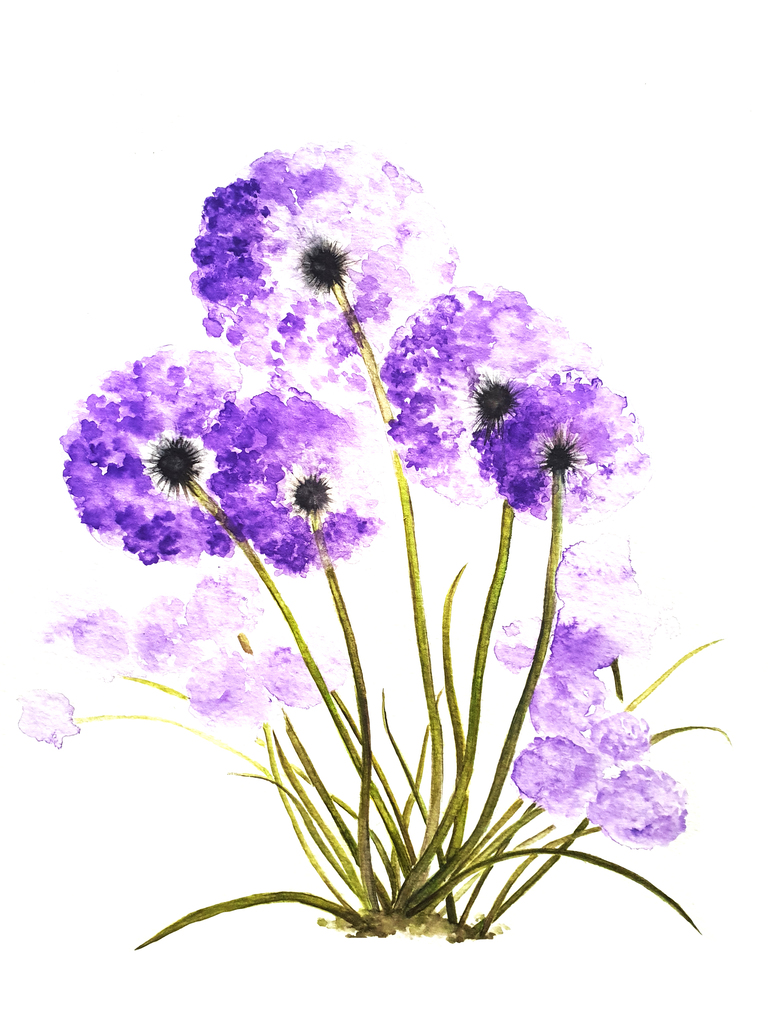 Waterverf schilderij met purpere tuinbloemen.