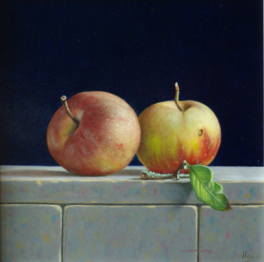 De compositie wordt bepaald door de vorm en kleur van de 2 appels
