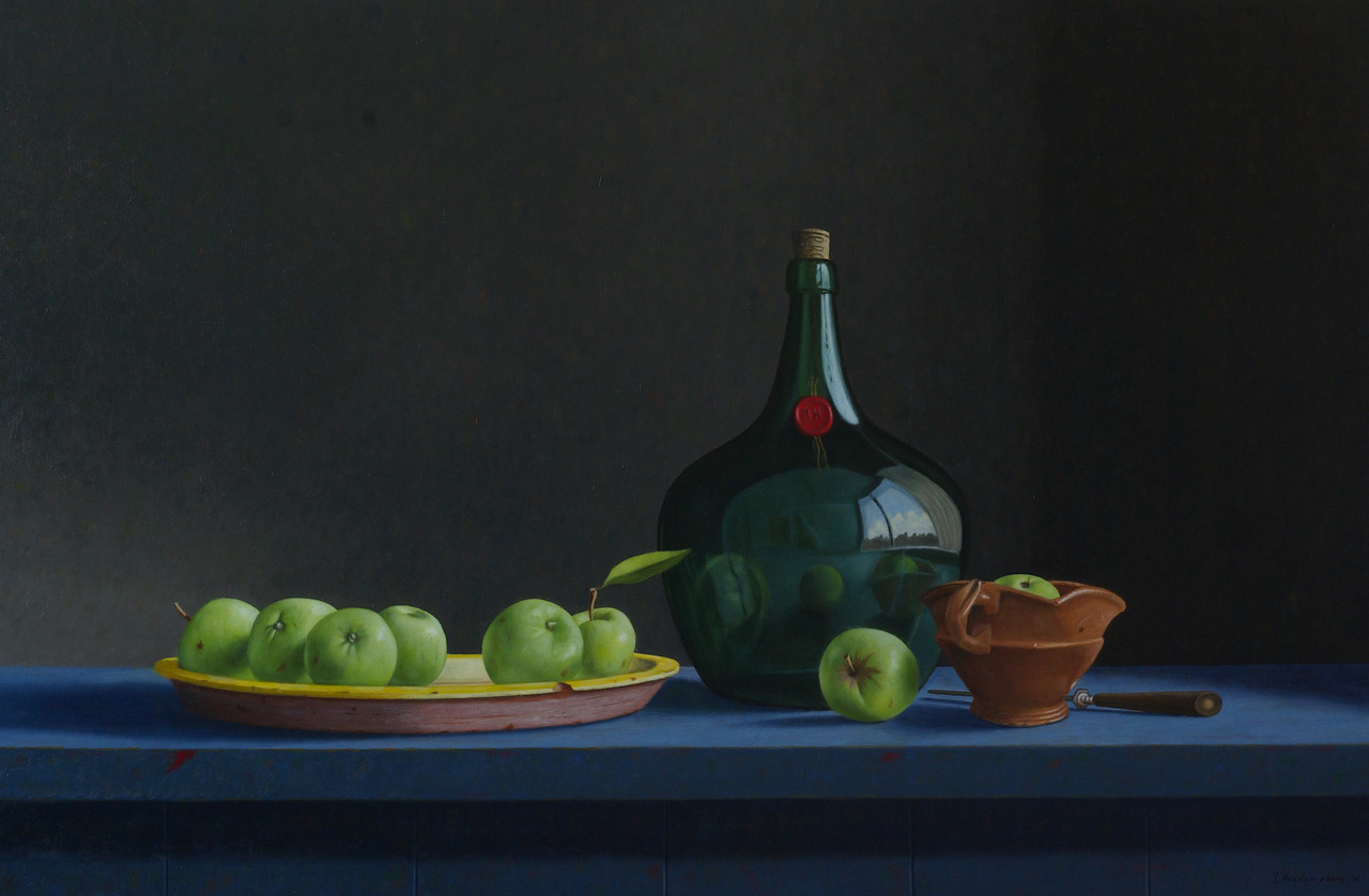 De compositie wordt gevormd door de groene buikfles, turkse schaal met groene appels en de tess.