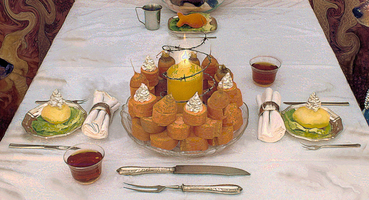 detail van Amnesty Inter Animal (brandende kaars, aardappels, gedekte tafel)
