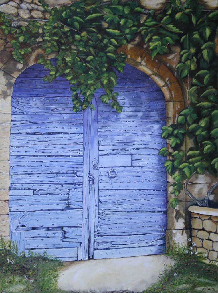Een oude deur van een grote vervallen schuur in de Provence. Mooi door zijn reparaties, maar wat zit er achter?