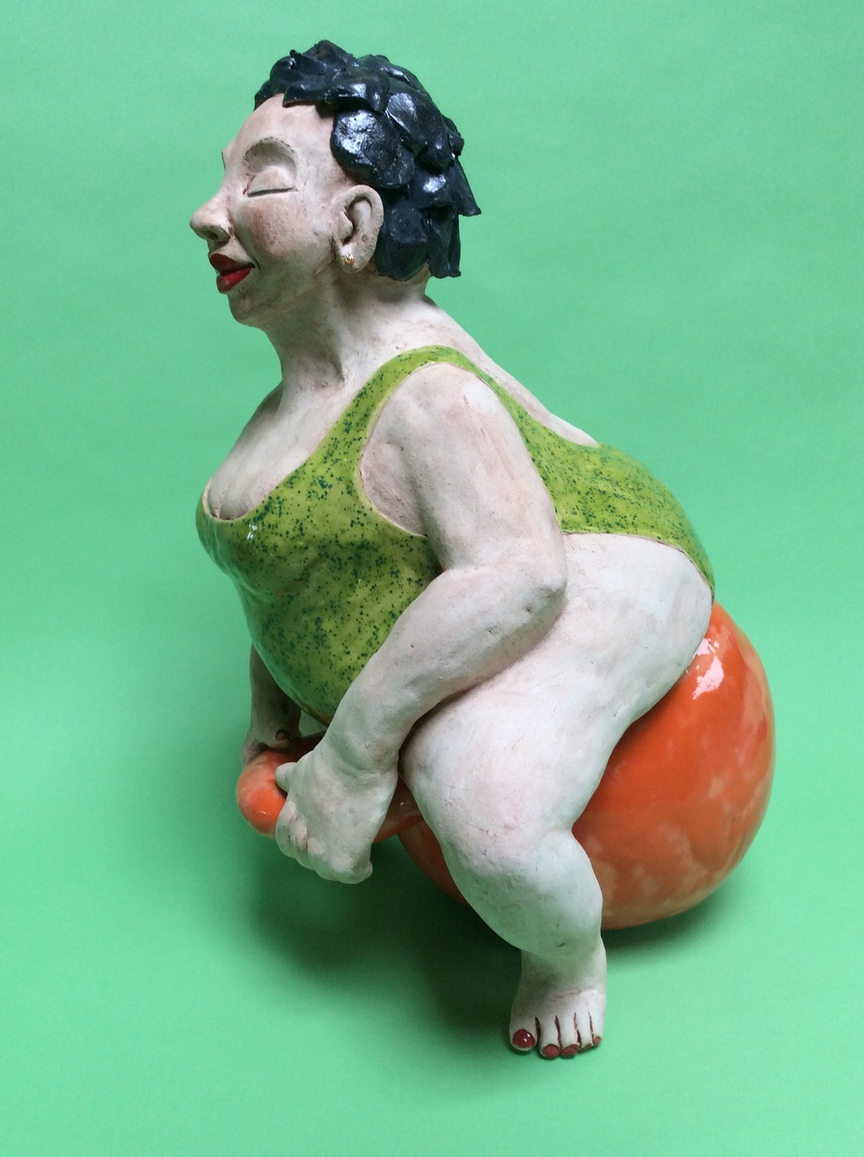 Vrouw op skippybal. Keramiek afgewerkt met glanzende en matte glazuur