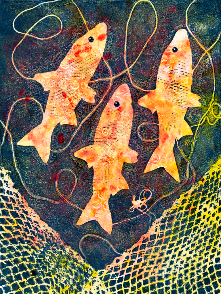 Afbeelding 22,5x 30,5 cm op A3 300 grams papier. Drie haringen bij visnet.