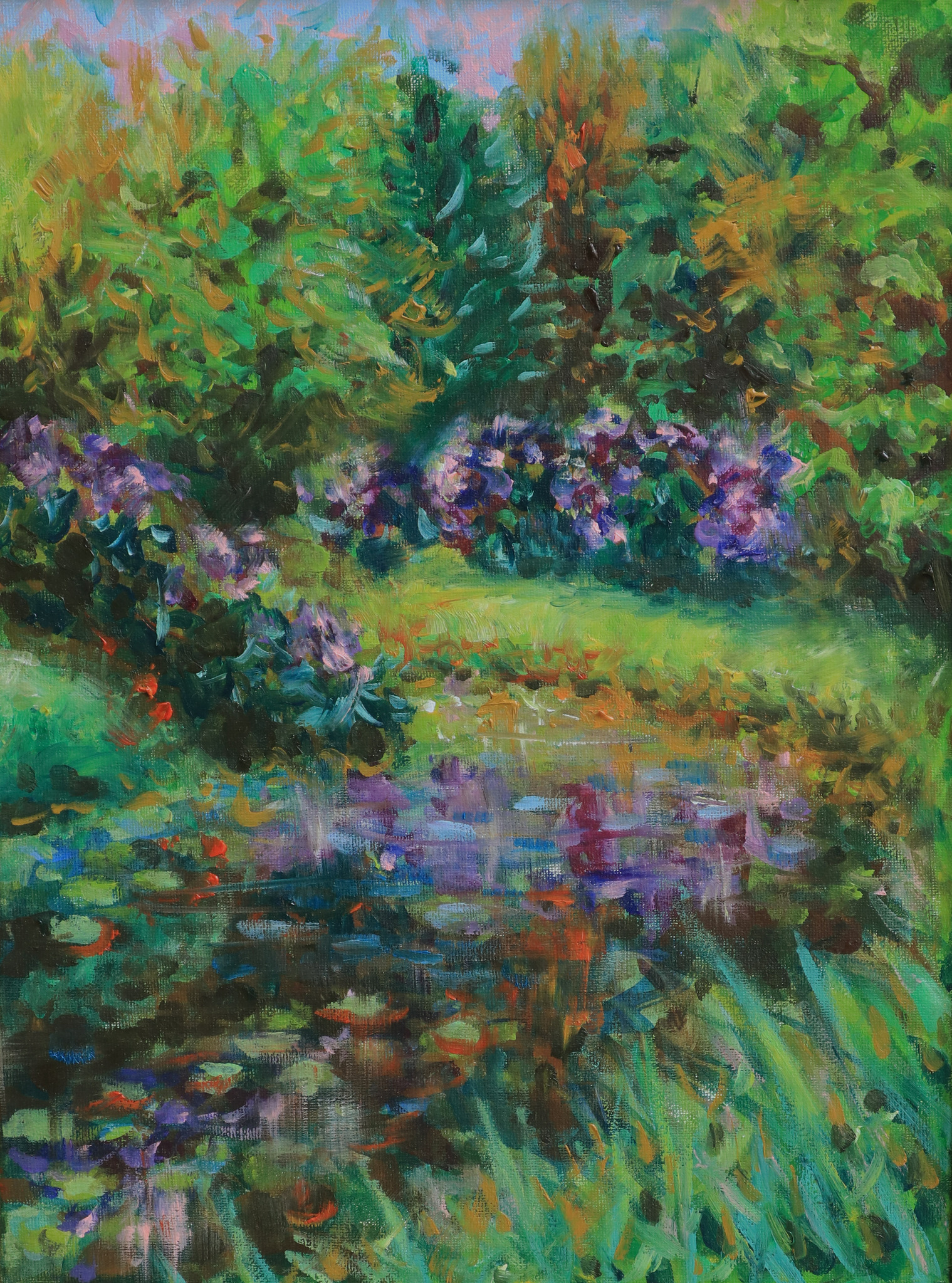 Een sfeervol stukje met rododendrons aan het water, bij natuurgebied de Manteling, tussen Domburg en Oostkapelle. = ingelijst in een houten baklijst