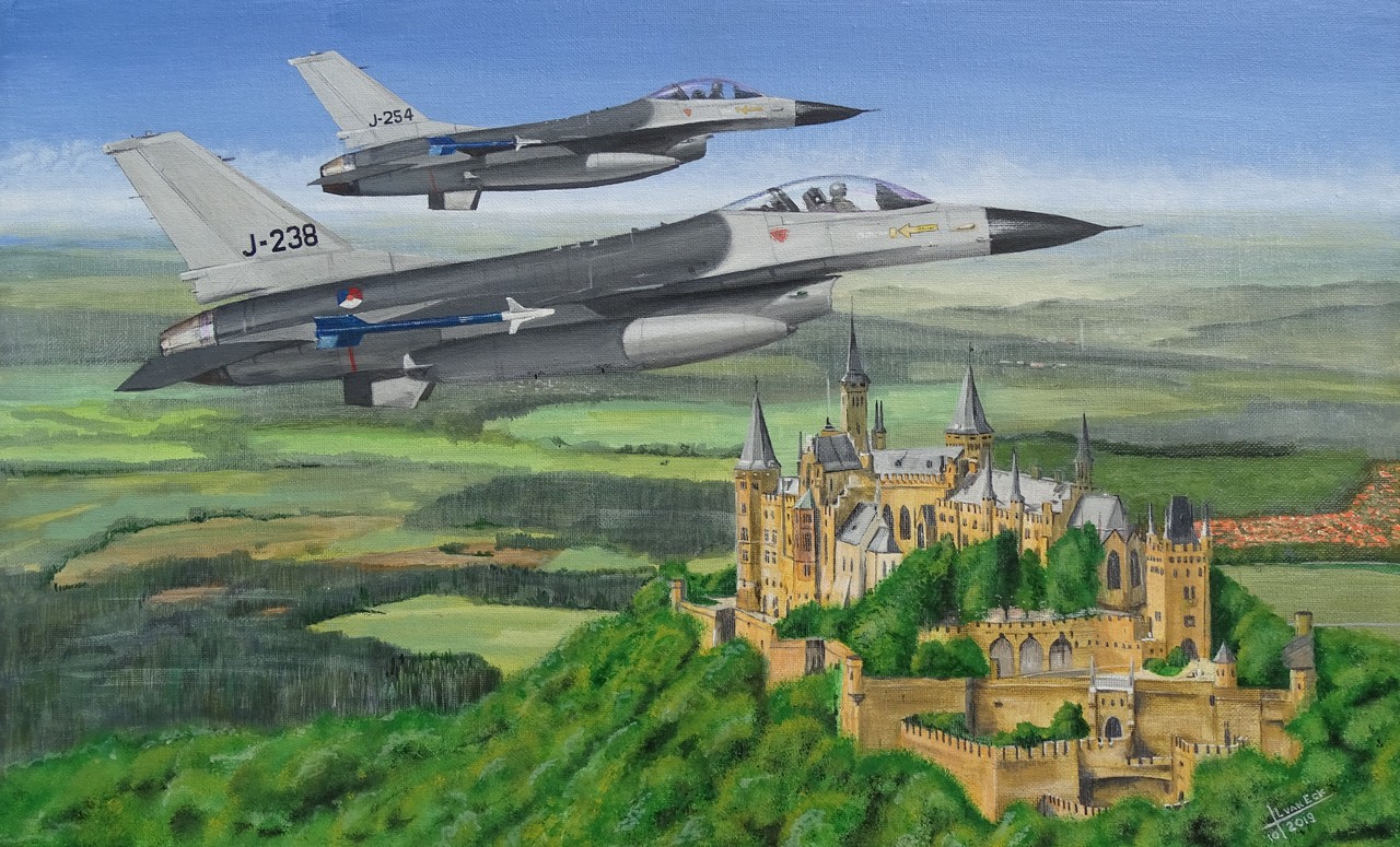 Twee vroege Nederlandse F16's boven Burg Hohenzollern.