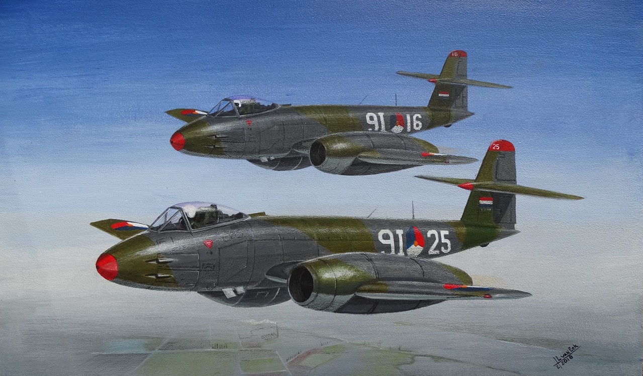 Twee Gloster Meteors Mk 8 van 326 SQN van de Koninklijke Luchtmacht boven het rivierengebied.