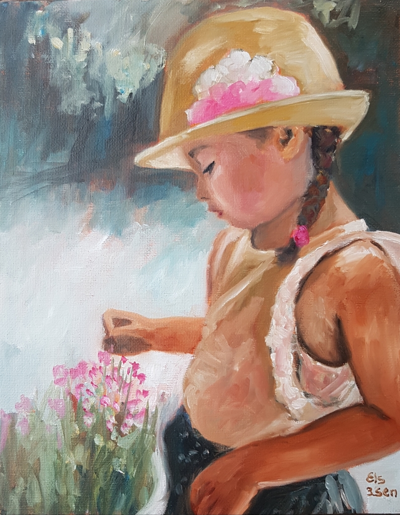 Olieverf werkje van een klein meisje die bloemetjes plukt
