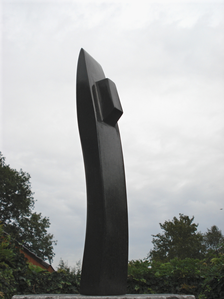serpentijn Het bijzondere van beeldhouwen is dat een stuk steen met een uitstulping (het maakt niet uit of het rond, vierkant of een andere vorm heeft) het idee geeft dat er een persoon uitgebeeld wordt. Door de achtergrond op de foto en door de opname van onderen krijg je de indruk van een groot beeld. Het beeld is echter maar 35 cm. hoog.