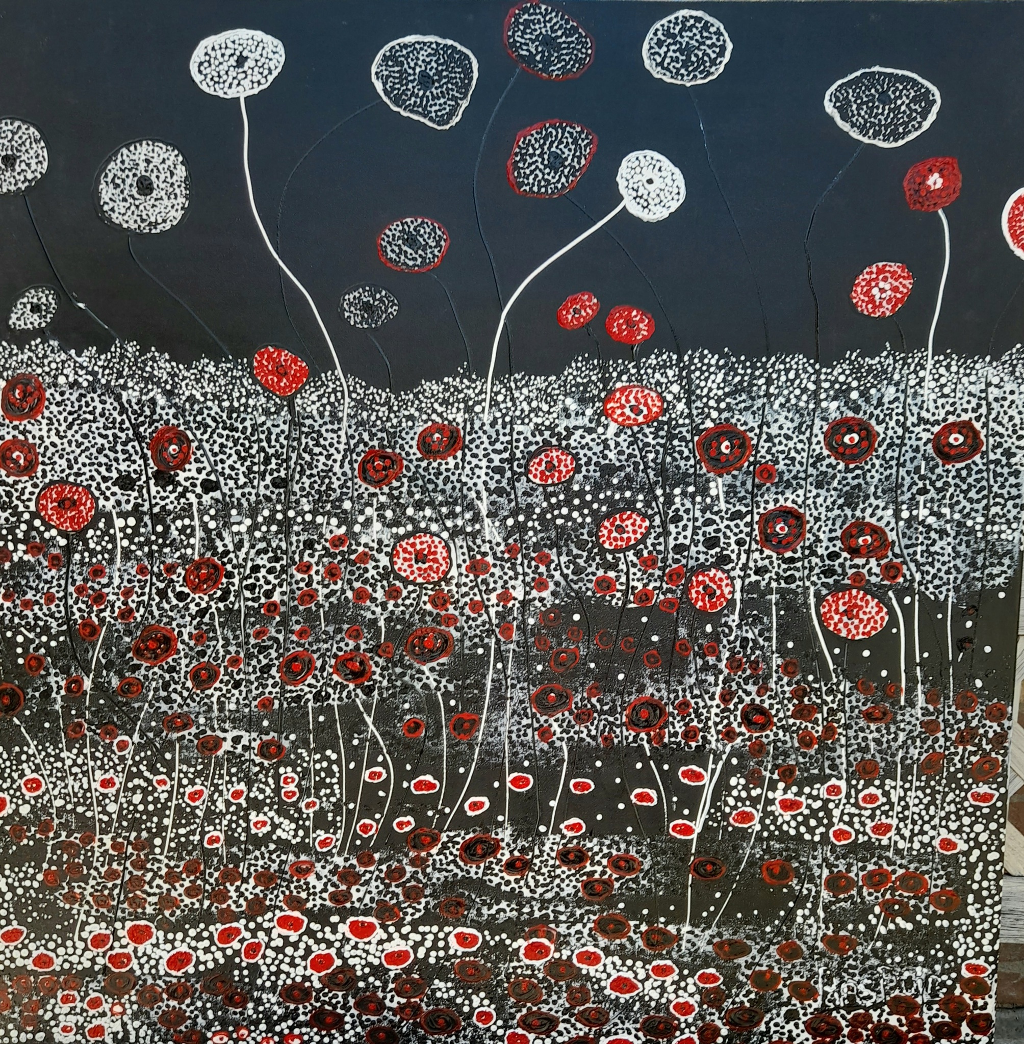 Expression in black and white with red details is painted pasty on premium cotton and finished with varnish. The pitch-black background with white flowers pasty painted on it makes this painting a real eye-catcher. Including suspension system. Does not require a frame, painted sides. Free delivery in the Netherlands.