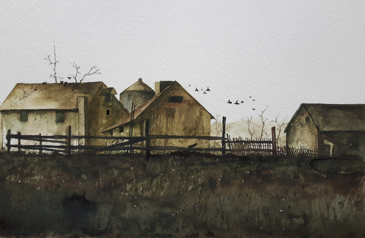 Een jaar geleden ontdekte ik Andrew Newell Wyeth (1917-2009). Wyeth was een zeer gerenommeerde Amerikaanse kunstenaar. En legde gelijk de focus op zijn aquarellen. Raakte begeesterd van zijn kunst. Vanaf 1939 begon hij met een bijna fotografische nauwkeurigheid landschapsschilderijen te schilderen van met name Pennsylvania en Maine waar hij zijn zomers doorbracht. Wyeth maakte gebruik van tempera dat zijn zwager Peter Hurd bij hem geïntroduceerd had. Hij schilderde verlaten plekken met hier en daar een eenzame figuur en maakte vaak gebruik van bruinen en grijzen. Zijn Farmhouse on Mill Road behoort tot de aquarellen die hij maakte in een van zijn meest favoriete omgevingen. Andrew Wyeth woonde er vanaf 1959. Plaats: Birmingham, Pennsylvania (USA) Het aquarel is gemaakt op 300 grams Canson papier. De vermelde verkooprijs is zonder lijst / glas.