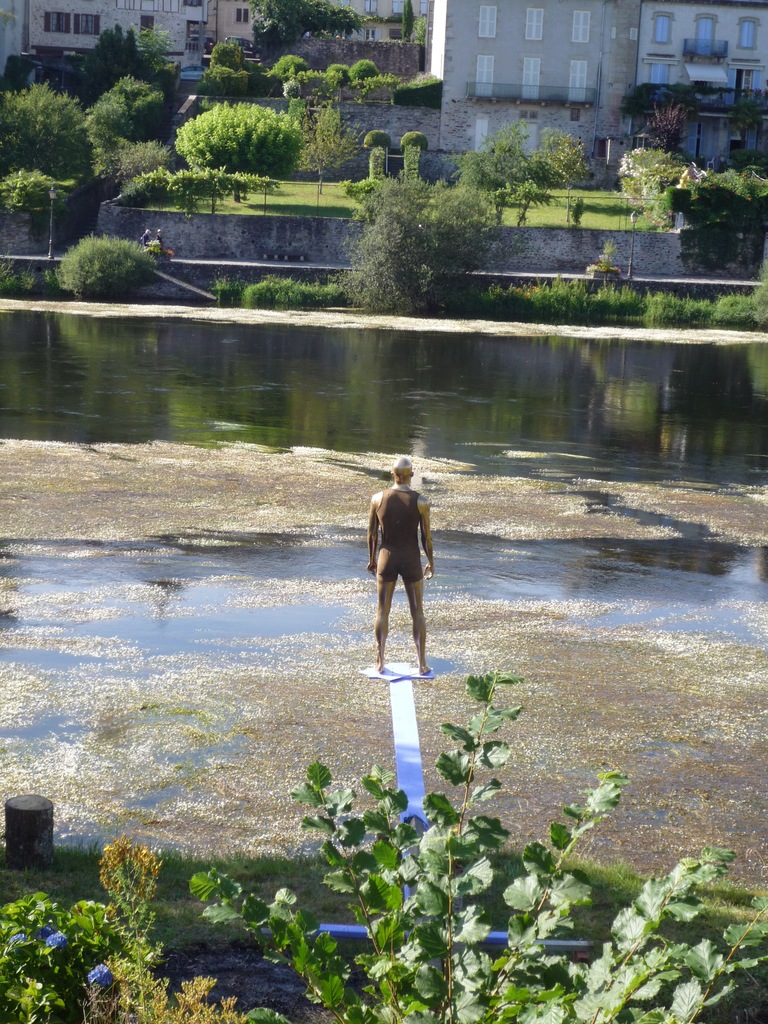 installatie van verschillende materialen aan de oever van de rivier de Dordogne in het Franse stadje Argentat (Corrèze)