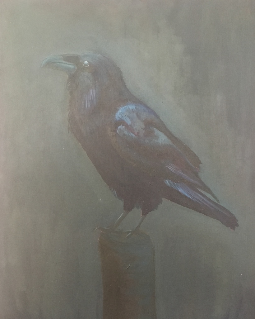 Zwarte raaf op zwarte achtergrond. Afhankelijk van de lichtval is de vogel beter of minder goed te zien, wat het een spannend werk maakt.